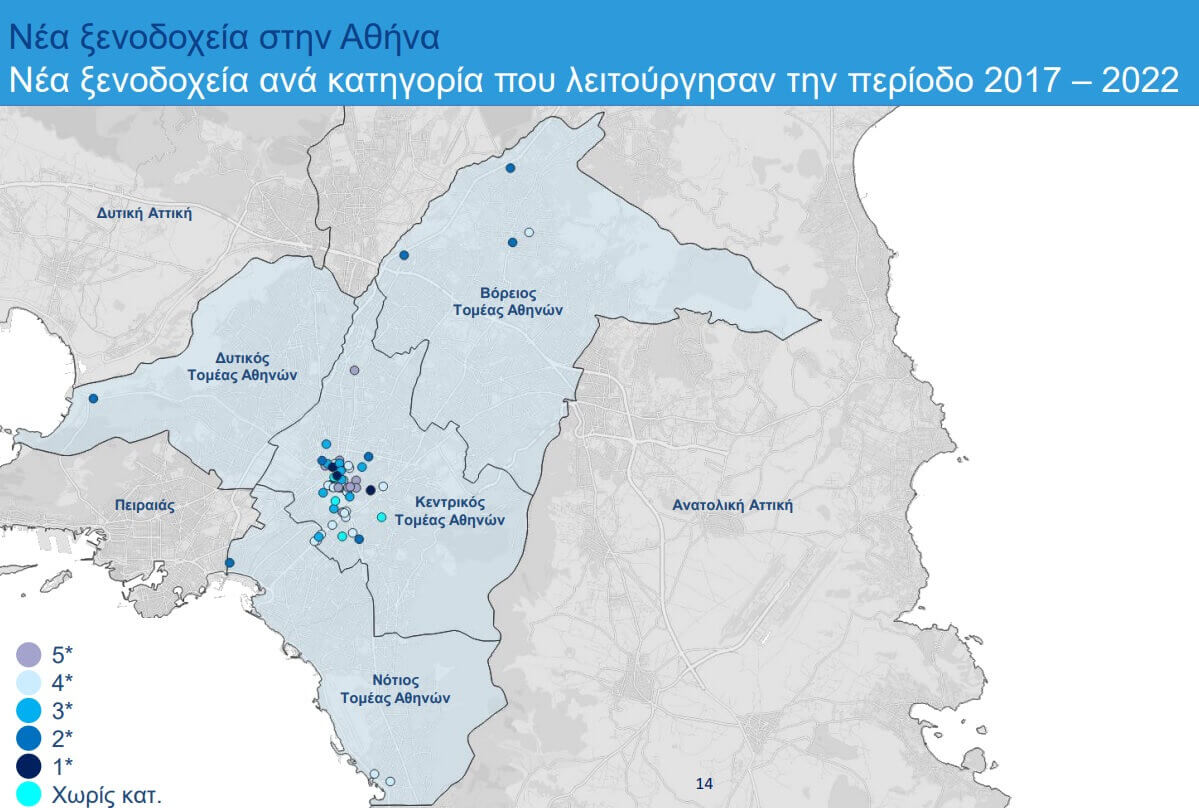 Σύμφωνα με τα στοιχεία της GBR Consulting την περίοδο 2017 – αρχές 2022, 71 νέα ξενοδοχεία άνοιξαν στην Αθήνα (Κεντρικός, Νότιος, Βόρειος και Δυτικός Τομέας Αθηνών).