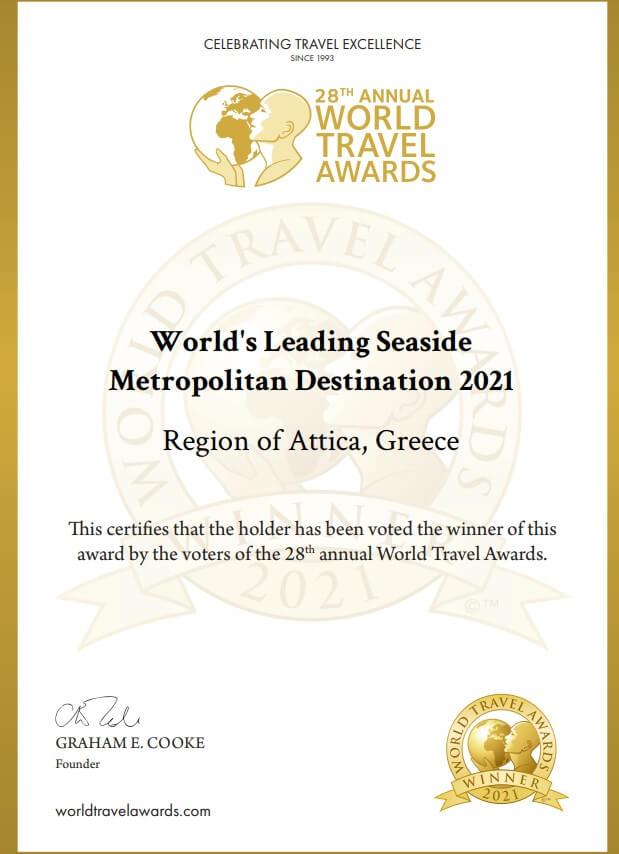 Kορυφαίος Μητροπολιτικός Παραθαλάσσιος Προορισμός για το 2021 αναδείχθηκε η Αττική, καθώς κατέκτησε την πρώτη θέση παγκοσμίως στην κατηγορία «World’s Leading Seaside Metropolitan Destination», των World Travel Awards.