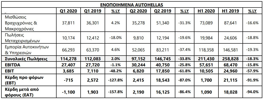 Μεγάλη μείωση σημείωσαν τα καθαρά κέρδη του ομίλου Autohellas το πρώτο εξάμηνο του 2020, λόγω της πανδημίας του κορονοϊού.