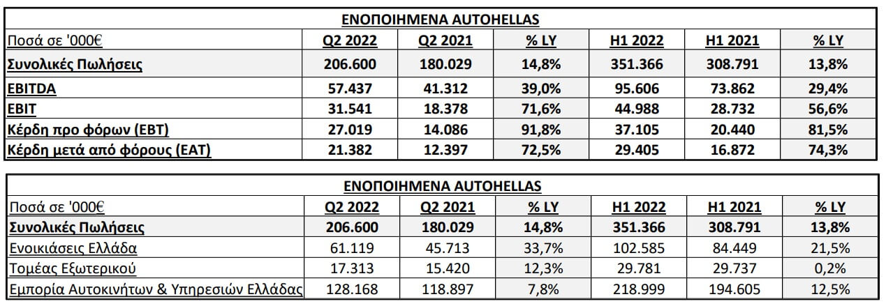 Το δεύτερο τρίμηνο (Απρίλιος – Ιούνιος) του 2022, η Autohellas κατέγραψε βελτίωση τόσο σε επίπεδο κύκλου εργασιών όσο και σε επίπεδο κερδοφορίας.