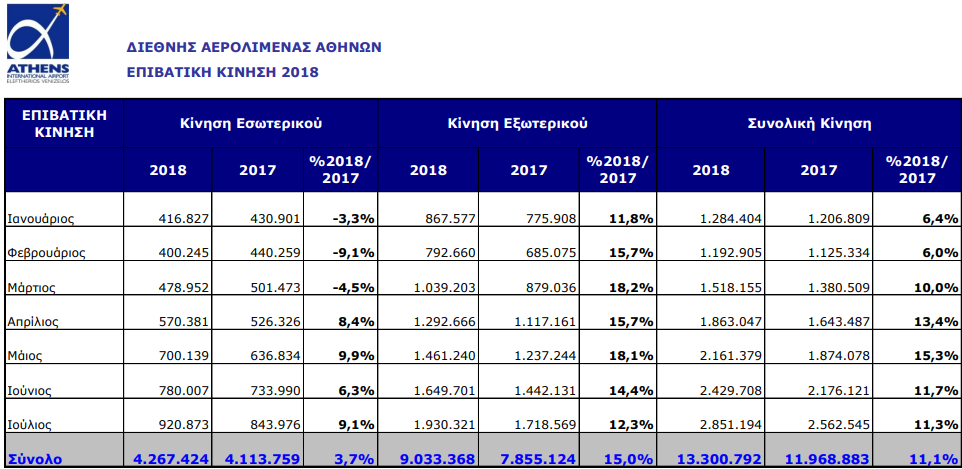 Την περίοδο Ιανουαρίου – Ιουλίου του 2018, η κίνηση του αεροδρομίου της Αθήνας έφτασε τους 13,3 εκατ. επιβάτες, σημειώνοντας άνοδο 11,1%, σε σχέση με το ίδιο διάστημα του 2017, με τόσο την κίνηση εσωτερικού, όσο και την κίνηση εξωτερικού, να παρουσιάζουν αύξηση 3,7% και 15% αντίστοιχα.