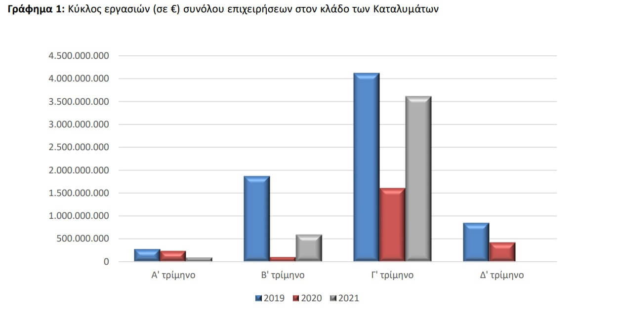 Στο σύνολο των επιχειρήσεων του κλάδου των καταλυμάτων, ο κύκλος εργασιών το τρίτο τρίμηνο (Ιούλιος – Σεπτέμβριος) του 2021 ανήλθε στα 3.612.942.597 ευρώ, σημειώνοντας αύξηση 125,9% σε σχέση με το τρίτο τρίμηνο του 2020, όπου είχε ανέλθει σε 1.599.439.486 ευρώ, σύμφωνα με ανακοίνωση της Ελληνικής Στατιστικής Αρχής (ΕΛΣΤΑΤ).