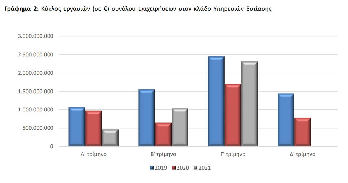Στο σύνολο των επιχειρήσεων του κλάδου των υπηρεσιών εστίασης, ο κύκλος εργασιών το τρίτο τρίμηνο του 2021 ανήλθε σε 2.313.310.051 ευρώ, σημειώνοντας αύξηση 36,5% σε σχέση με το τρίτο τρίμηνο του 2020, όπου είχε ανέλθει σε 1.694.943.977 ευρώ.