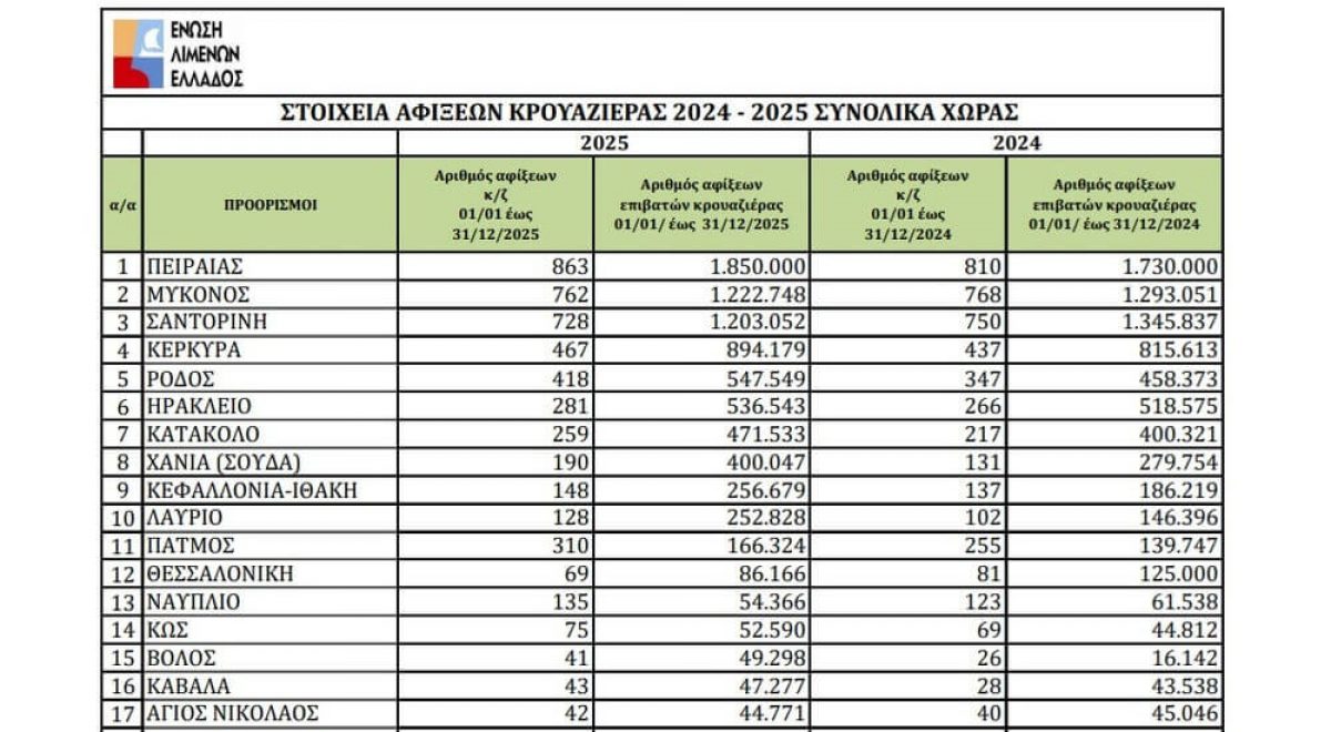 Αύξηση 25% αναμένεται φέτος σε σχέση με το 2019 στις αφίξεις κρουαζιερόπλοιων στα ελληνικά λιμάνια, σύμφωνα με τη δημοσιοποίηση των στοιχείων αφίξεων κρουαζιέρας για το 2022 με βάση τις έως σήμερα κρατήσεις, αλλά και τα πραγματικά δεδομένα, όπως έχουν διαμορφωθεί τους πρώτους πέντε μήνες του χρόνου, δηλαδή έως και το Μάιο, από την Ένωση Λιμένων Ελλάδας.