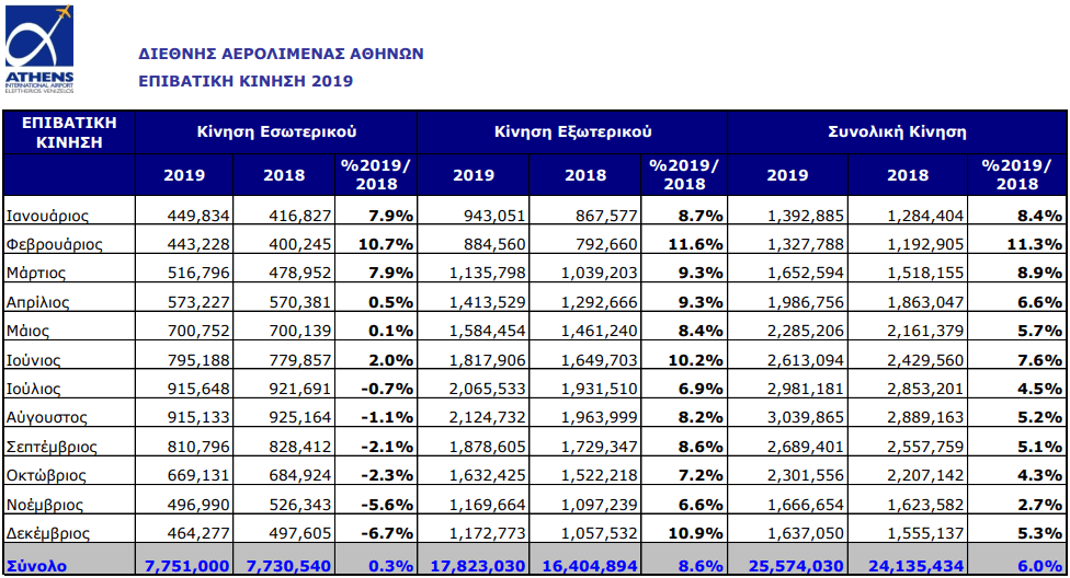 Το 2019, ο Διεθνής Αερολιμένας Αθηνών, με 25.574.030 επιβάτες, κατέγραψε την καλύτερη ιστορική επίδοσή του από πλευράς επιβατικής κίνησης, ξεπερνώντας κατά 1.400.000 επιβάτες (+6%) την κίνηση του 2018 (24.135.434 επιβάτες).