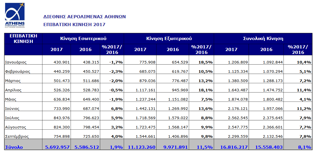 Επιπλέον, κατά τη διάρκεια του Σεπτεμβρίου, η επιβατική κίνηση του αεροδρομίου έφθασε τα 2.299.559 επιβάτες, σημειώνοντας  αύξηση 7,8%, σε σχέση με το Σεπτέμβριο του 2016 (2.132.546). Η αύξηση οφείλεται στην άνοδο τόσο της κίνησης εσωτερικού (4%) όσο και της κίνησης εξωτερικού (9,8%).