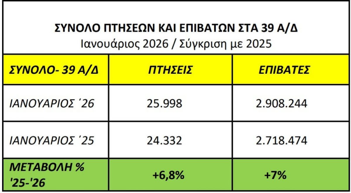 Αύξηση 9,1%, σημειώθηκε στην επιβατική κίνηση το πρώτο δίμηνο (Ιανουάριος – Φεβρουάριος) του 2026 στο σύνολο των 39 αεροδρομίων της χώρας, σύμφωνα με σχετική ανακοίνωση της Υπηρεσίας Πολιτικής Αεροπορίας (ΥΠΑ).
