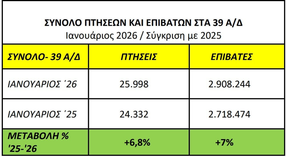 Αύξηση 7% σημειώθηκε το φετινό Ιανουάριο στο σύνολο των αεροδρομίων της χώρας (39), που διεξάγονται εμπορικές πτήσεις. Συγκεκριμένα, η επιβατική κίνηση έφτασε τα 2.908.244, έναντι 2.718.474 επιβατών τον Ιανουάριο του 2025, σύμφωνα με σχετική ανακοίνωση της Υπηρεσίας Πολιτικής Αεροπορίας (ΥΠΑ).