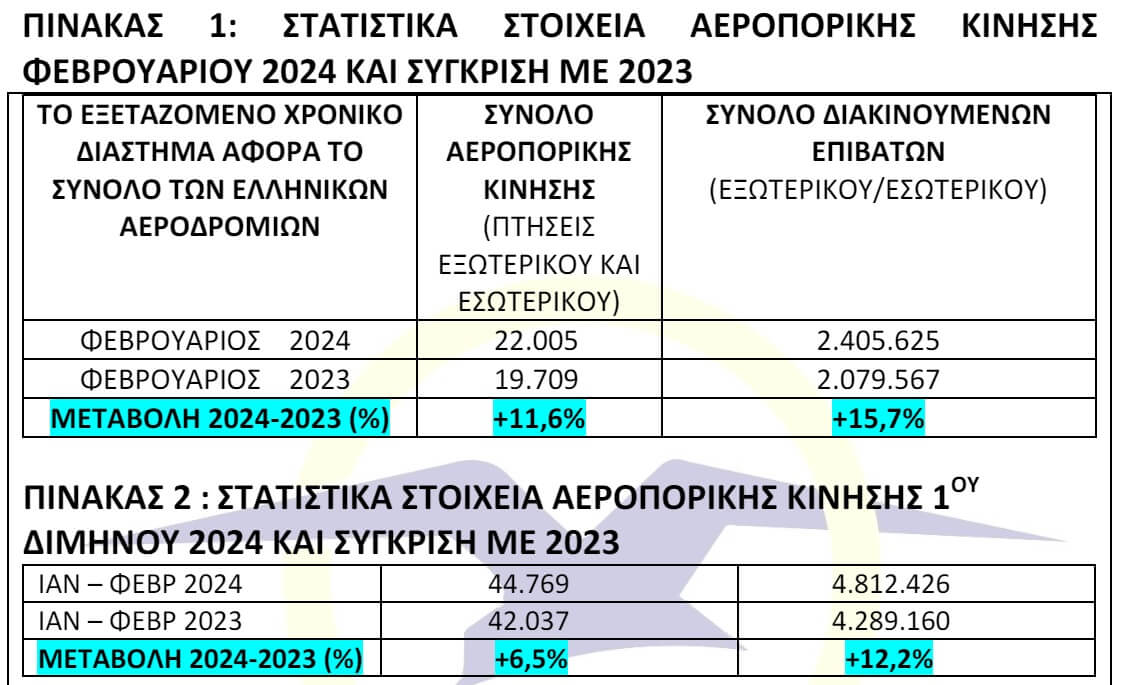 Επίσης, το 1ο δίμηνο του 2024 πραγματοποιήθηκαν 44.769 πτήσεις, έναντι 42.037 πτήσεων το 1ο δίμηνο του 2023, με την αύξηση σε σχέση με πέρυσι να φτάνει το 6,5%.