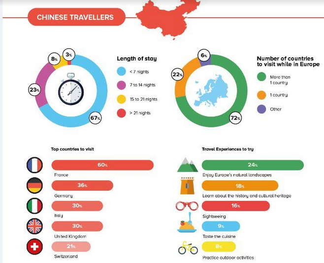 Επτά στους 10 Κινέζους, όταν έρχονται στην Ευρώπη ταξιδεύουν σε παραπάνω από μία χώρα, ενώ ως προς τα ενδιαφέροντά τους, ένα 24% δηλώνει ότι επιθυμεί να απολαμβάνει το φυσικό περιβάλλον, 18% να μάθει περισσότερα για την ιστορία και την πολιτιστική κληρονομιά, 16% να δει αξιοθέατα και 9% να δοκιμάσει τη γαστρονομία.