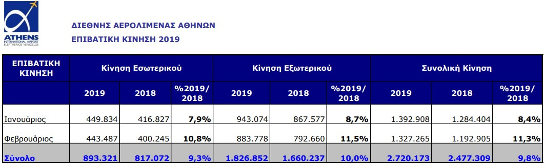 Συνολικά, κατά τους πρώτους δύο μήνες του έτους, η κίνηση του αεροδρομίου της Αθήνας έφθασε τους 2.720.173 επιβάτες, σημειώνοντας αύξηση 9,8%.