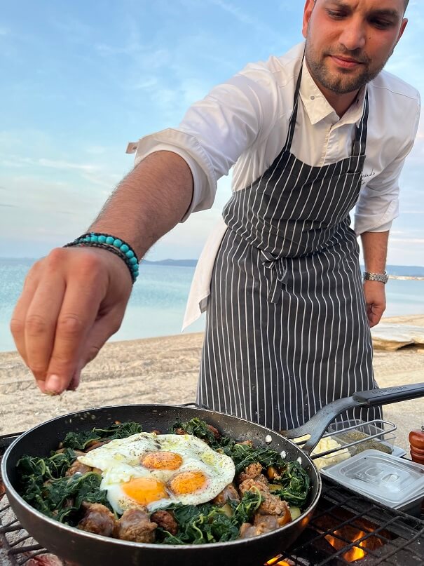 Η μία θα παντρέψει τα αυγά με τα παραδοσιακά λουκάνικα και τα άγρια χόρτα περιοχής και η δεύτερη θα τα συνδυάσει με τα τρυφερά μπριζολάκια μαύρου χοίρου, ο οποίος εκτρέφεται στη Βαρβάρα και στο Χολομώντα.