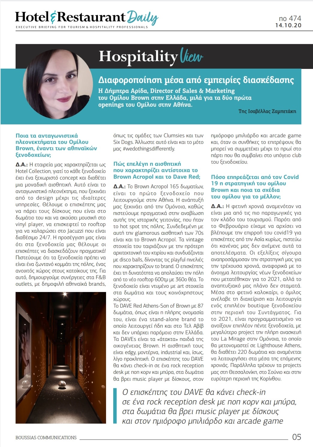 1. Συνέντευξη της Δήμητρας Αρίδα, της Director of Sales & Marketing της Brown Hotels στην Ελλάδα, στο Hotel & Restaurant (δείτε ΕΔΩ).