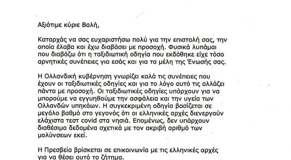 Απάντηση στην Ένωση Ξενοδόχων του νομού Σάμου, η οποία με επιστολή της διαμαρτυρόταν για την ταξιδιωτική οδηγία της Ολλανδίας για τα ελληνικά νησιά, λόγω