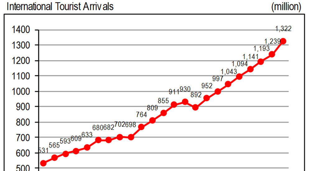 Ο παγκόσμιος αριθμός των τουριστών αυξήθηκε 7% το 2017, σε σχέση με το 2016, φτάνοντας το 1.322.000.000, σύμφωνα με τον Παγκόσμιο Οργανισμό Τουρισμού (World
