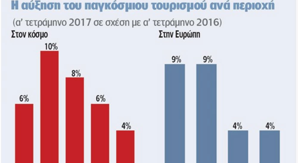 Aύξηση μεταξύ 3% και 4% εκτιμά ο Παγκόσμιος Οργανισμός Τουρισμού (WTO), ότι θα παρουσιάσει o παγκόσμιος αριθμός των τουριστών το 2017, με την Ευρώπη