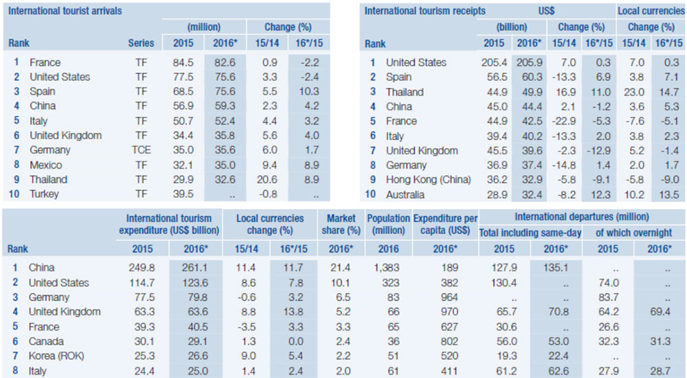 Σύμφωνα με τα στοιχεία του Παγκόσμιου Οργανισμού Τουρισμού (WTO), στην πρώτη θέση της παγκόσμιας κατάταξης σε ότι έχει να κάνει με τις αφίξεις τουριστών