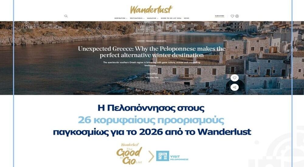 Η Πελοπόννησος επιλέχθηκε ανάμεσα στους 26 κορυφαίους προορισμούς παγκοσμίως για το 2026, σύμφωνα με τη Good to Go List 2026 του διεθνούς ταξιδιωτικού περιοδικού