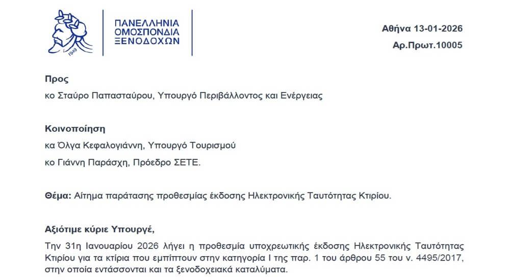 Η Πανελλήνια Ομοσπονδία Ξενοδόχων (ΠΟΞ), έστειλε επιστολή στον Υπουργό Περιβάλλοντος και Ενέργειας Σταύρο Παπασταύρου με αίτημα την παράταση της προθεσμίας έκδοσης Ηλεκτρονικής Ταυτότητας Κτηρίου,