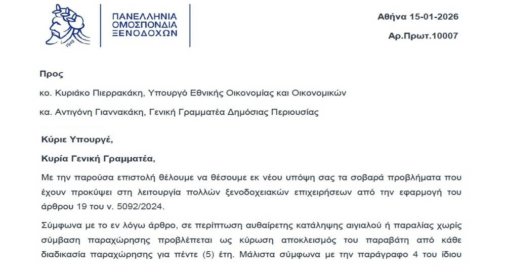 Η Πανελλήνια Ομοσπονδία Ξενοδόχων (ΠΟΞ), έστειλε επιστολή στον Υπουργό Εθνικής Οικονομίας και Οικονομικών, Κυριάκο Πιερρακάκη, με την οποία ζήτησε την άρση του 5ετή αποκλεισμού
