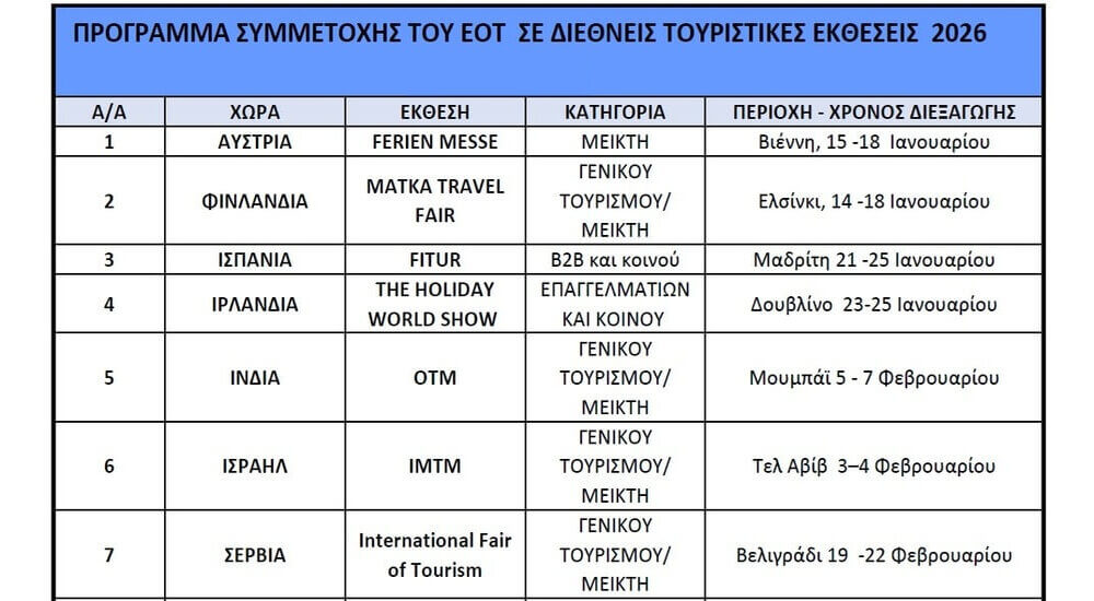 Ο Ελληνικός Οργανισμός Τουρισμού (ΕΟΤ), θα συμμετάσχει το διάστημα Ιανουαρίου - Μαΐου του 2026, σε 14 διεθνείς τουριστικές εκθέσεις στην Αυστρία, στη Φινλανδία, στην