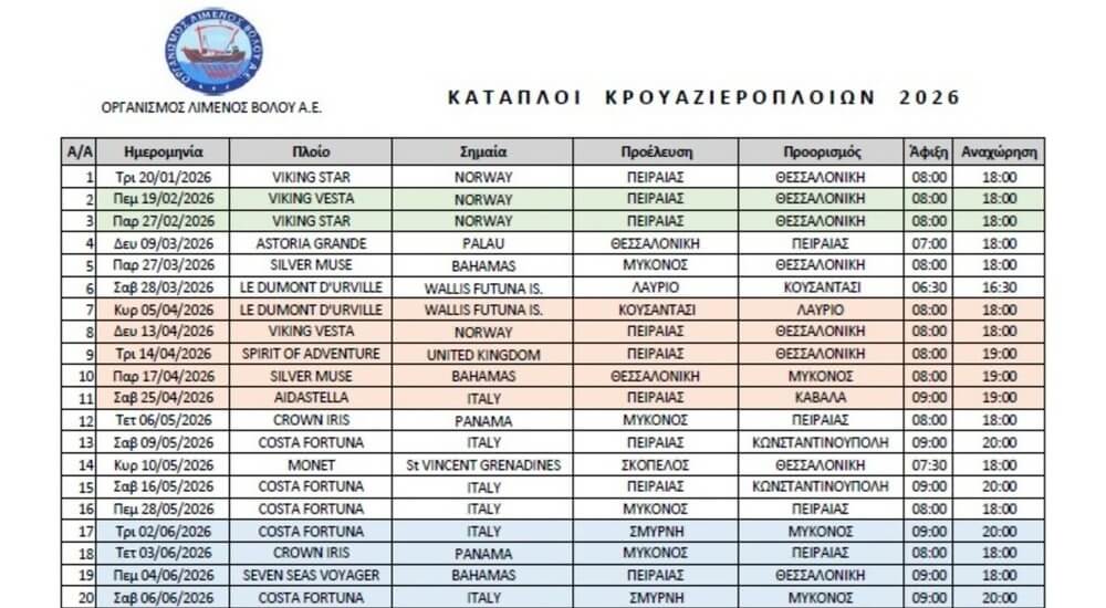 Το 2025 καταγράφηκαν 41 αφίξεις κρουαζιερόπλοιων με 49.298 επιβάτες στο λιμάνι του Βόλου. Το 2024, που ήταν μια ιδιαίτερα δύσκολη χρονιά για το λιμάνι του