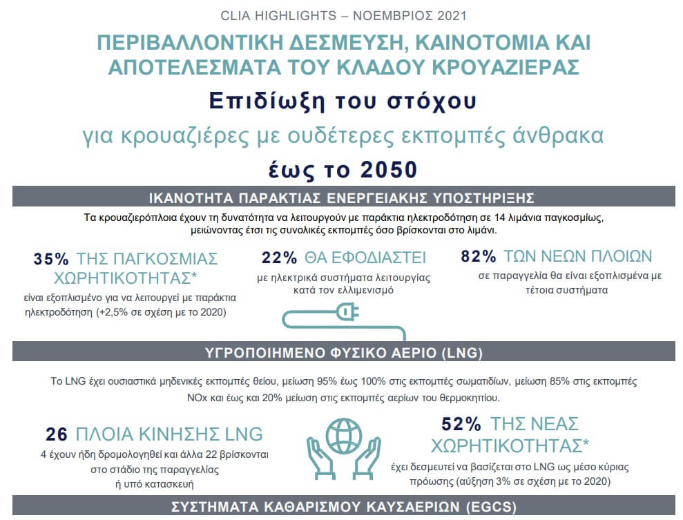 «Η CLIA και τα μέλη της επενδύουν σε νέες τεχνολογίες και καθαρότερα καύσιμα προκειμένου να ανταποκριθούν στο φιλόδοξο στόχο για κρουαζιέρες με ουδέτερες εκπομπές άνθρακα έως το 2050», πρόσθεσε η ίδια.