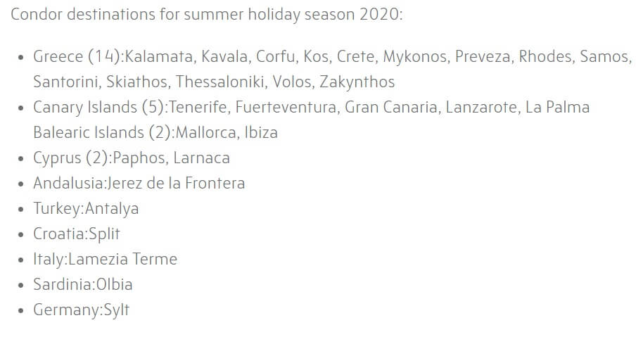 Είναι σημαντικό ότι από τους 29 προορισμούς που ανακοίνωσε η Condor, οι 14 είναι στην Ελλάδα (Καλαμάτα, Καβάλα, Κέρκυρα, Κως, Κρήτη, Μύκονος, Πρέβεζα, Ρόδος, Σάμος, Σαντορίνη, Σκιάθος, Θεσσαλονίκη, Βόλος και Ζάκυνθος) και δύο στην Κύπρο (Πάφος, Λάρνακα).