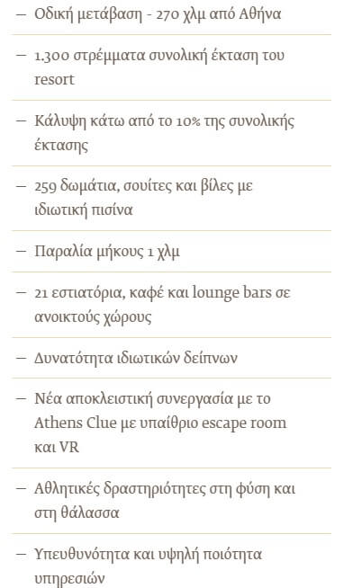 Η εύκολη οδική πρόσβαση, οι άπειρες δυνατότητες για υπαίθριες δραστηριότητες, η μαγευτική παραλία που εκτείνεται σε μήκος 1 χλμ. και οι 259 βίλες, σουίτες και δωμάτια με ιδιωτικές πισίνες, είναι μερικά μόνο από τα συστατικά που θα κάνουν τις φετινές διακοπές μοναδικές.
