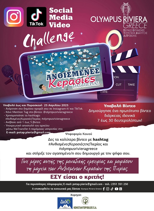 Ο ΠΟΤΑΠ προσκαλεί το κοινό να δημιουργήσει σύντομα βίντεο, ιδανικά διάρκειας 7 έως 30 δευτερολέπτων, αποτυπώνοντας τη μαγευτική εικόνα των ανθισμένων κερασιών της Πιερίας.