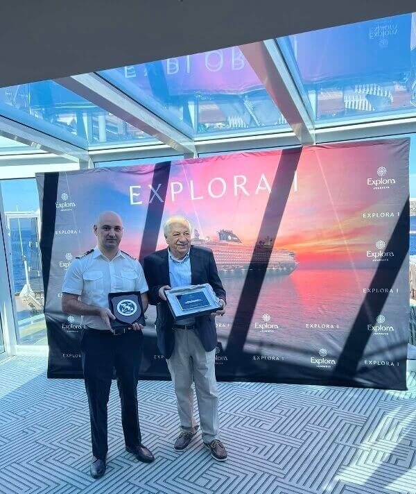 Φωτογραφία: Στιγμιότυπο από επίσκεψη του Προέδρου του Λιμενικού Ταμείου Μυκόνου στο κρουαζιερόπλοιο «Explora I», όπου αντάλλαξε αναμνηστικές πλακέτες με τον Πλοίαρχο.