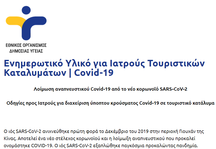 Διαβάστε ΕΔΩ το σχετικό έγγραφο του ΕΟΔΥ με τίτλο: «Οδηγίες προς Ιατρούς: Διαχείριση ύποπτου κρούσματος COVID-19 σε τουριστικό κατάλυμα».