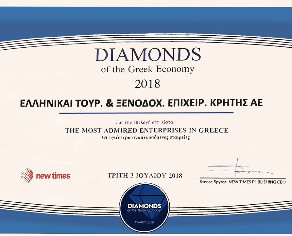 Για δεύτερη συνεχή χρονιά ο όμιλος Cyan group of hotels διακρίθηκε στα βραβεία επιχειρηματικής αριστείας Diamonds of the Greek Economy 2018, στην κατηγορία «Υγιέστερα Αναπτυσσόμενες Εταιρείες» στην Ελλάδα.