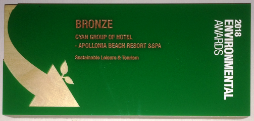 Λίγες μέρες αργότερα ακολούθησε άλλη μία σημαντική διάκριση για το Apollonia Beach Resort & Spa του ομίλου Cyan Group of Hotels. Το Apollonia Beach Resort & Spa διακρίθηκε στα Environmental Awards 2018 στην κατηγορία «Sustainable Leisure & Tourism», λαμβάνοντας Bronze award για τις δράσεις αειφορίας σε όλο το φάσμα λειτουργίας του ξενοδοχείου.