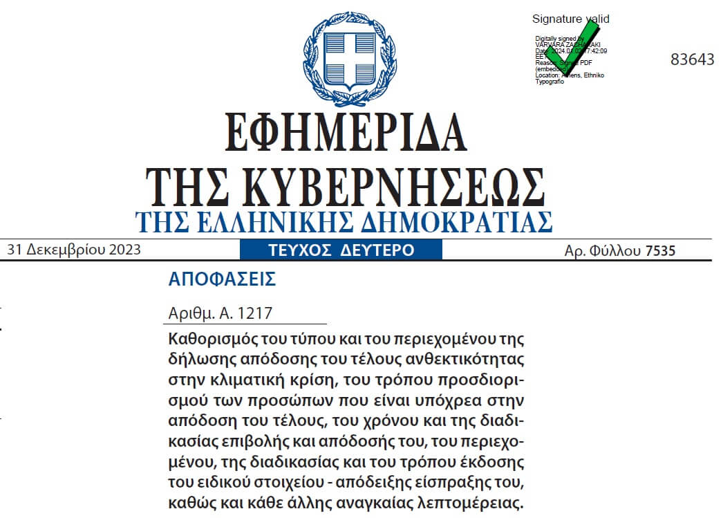Όλες οι νέες διατάξεις περιλαμβάνονται στην Κοινή Υπουργική Απόφαση (ΚΥΑ) με Α.1217/2023 (ΦΕΚ Β’7535/31.12.2023) με τίτλο «Καθορισμός του τύπου και του περιεχομένου της δήλωσης απόδοσης του τέλους ανθεκτικότητας στην κλιματική κρίση, του τρόπου προσδιορισμού των προσώπων που είναι υπόχρεα στην απόδοση του τέλους, του χρόνου και της διαδικασίας επιβολής και απόδοσής του, του περιεχομένου, της διαδικασίας και του τρόπου έκδοσης του ειδικού στοιχείου – απόδειξης είσπραξης του, καθώς και κάθε άλλης αναγκαίας λεπτομέρειας».