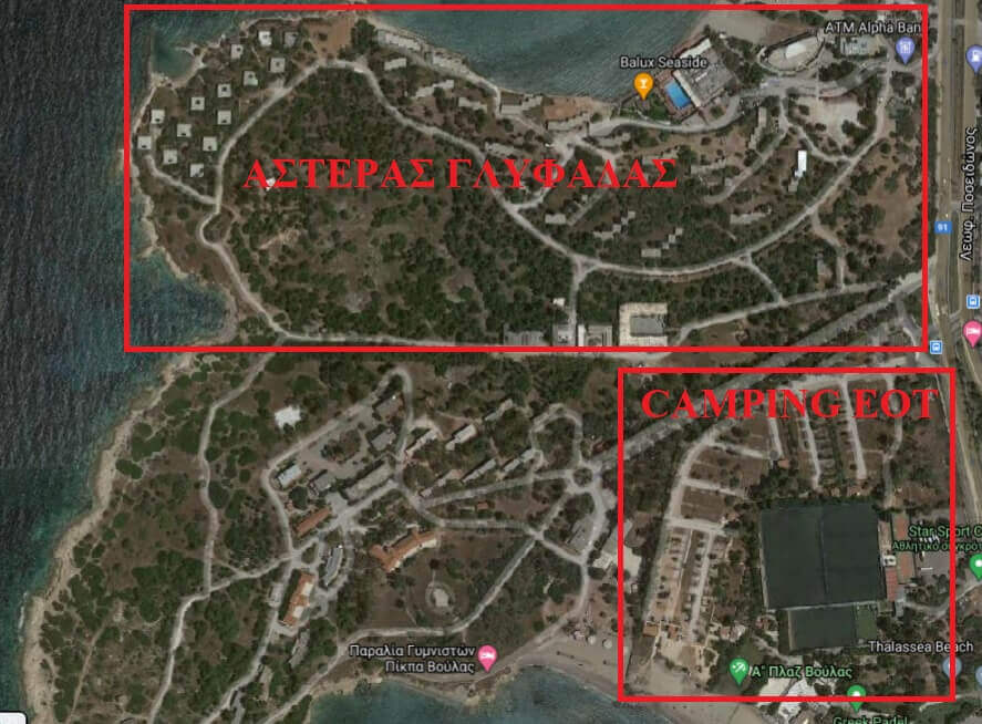 Στην παρακάτω πανοραμική φωτογραφία από το Google Maps βλέπουμε τις δύο γειτονικές εκτάσεις (Αστέρας Γλυφάδας, Camping ΕΟΤ), στις οποίες θα δημιουργηθούν το One & Only Resort και το camping πέντε αστέρων.