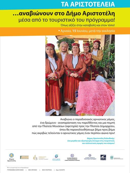 Εκδήλωση Πολιτισμού με υψηλό ιστορικό υπόβαθρο διοργανώνει ο Δήμος Αριστοτέλη Χαλκιδικής την Κυριακή 15 Ιουνίου στην Αρναία, αναβιώνοντας για δεύτερη χρονιά το «γάμο του παρελθόντος», που για τον οικισμό αποτελεί διαχρονικό τρόπο έκφρασης μιας μεγάλης παραδοσιακής παρακαταθήκης.