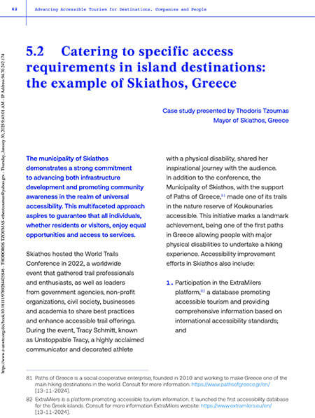Ο οδηγός δημοσιεύθηκε στις 30 Ιανουαρίου 2025 (δείτε ΕΔΩ), σε συνέχεια του διεθνούς συνεδρίου TOURISM FOR ALL που διοργάνωσε ο Παγκόσμιος Οργανισμός Τουρισμού, στο Σαν Μαρίνο με θέμα «Η προσβασιμότητα ως επιχειρηματική ευκαιρία: Πώς αποφέρει οφέλη στον τουριστικό κλάδο;» το διάστημα 16 – 17 Νοεμβρίου 2023 όπου συμμετείχε ο Δήμος Σκιάθου, ο μοναδικός δήμος που συμμετείχε στο συνέδριο.