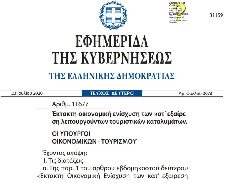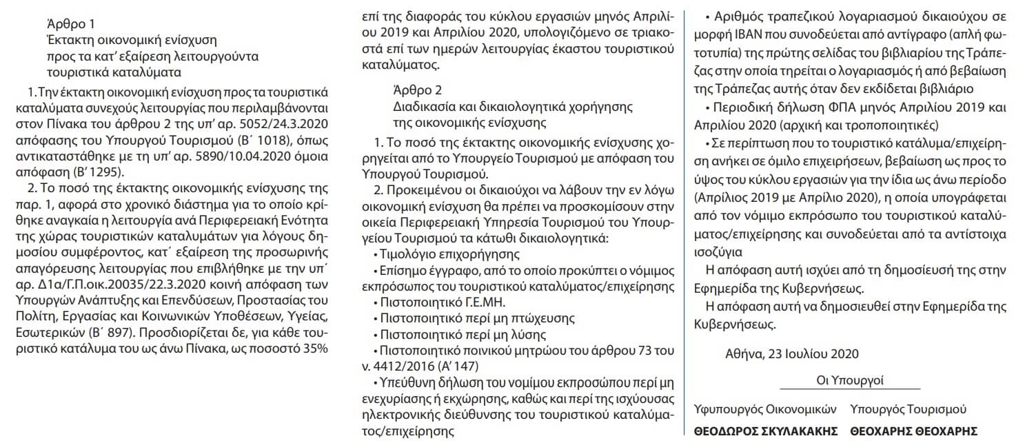 Δημοσιεύθηκε η Απόφαση των Υπουργών Οικονομικών και Τουρισμού για την έκτακτη οικονομική ενίσχυση των κατ΄ εξαίρεση λειτουργούντων τουριστικών καταλυμάτων (αριθμ.11677/23-07-2020 ΦΕΚ Β’3073/2020).
