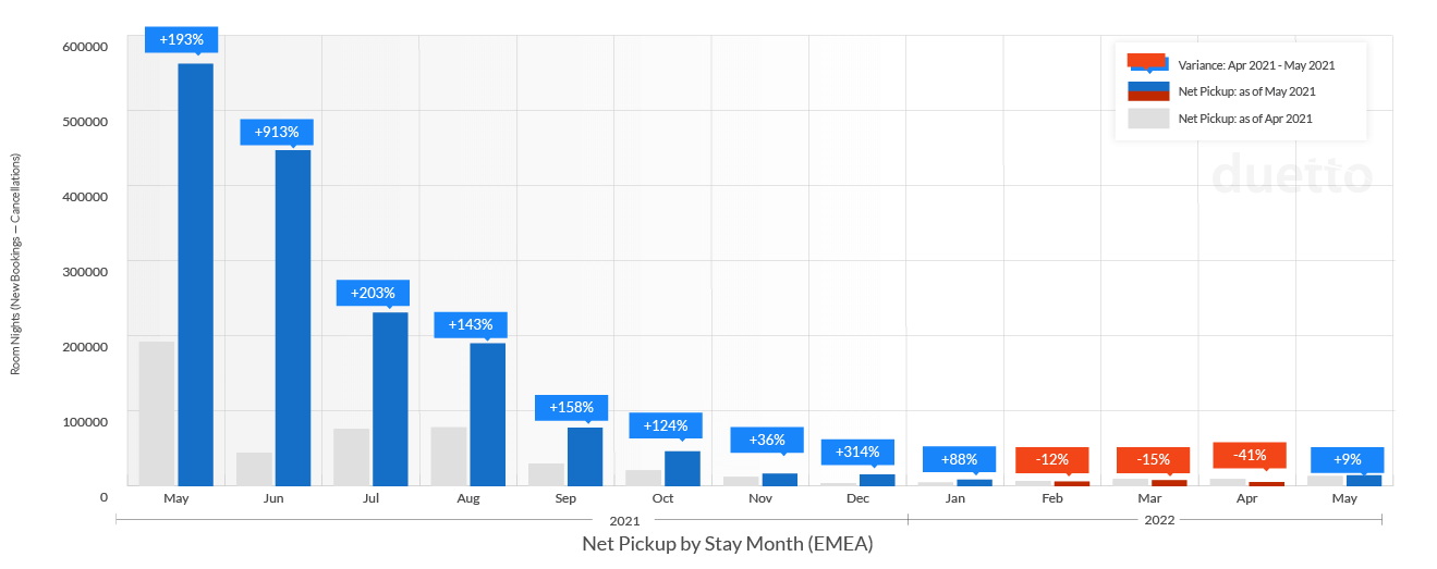 Οι κρατήσεις σε όλη την περιοχή της Ευρώπης αυξήθηκαν κατά 913% το Μάιο για τις ημερομηνίες διαμονής τον Ιούνιο, με εντυπωσιακά κέρδη να διαφαίνονται μέχρι τον Ιανουάριο του 2022.