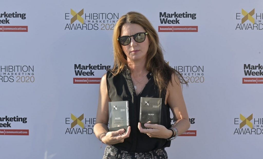 Φωτογραφία: H Ειρήνη Κρητικού, RAC Sales Manager της LG Electronics Hellas, με τα δύο βραβεία στα Exhibition Marketing Awards.
