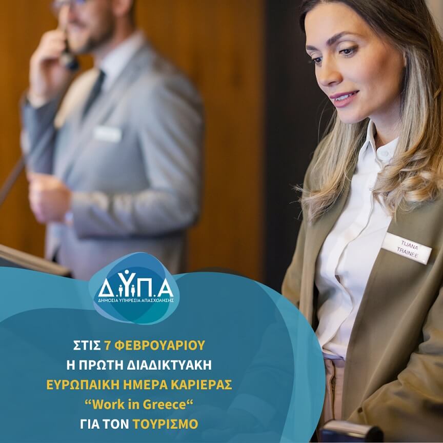 Στο πλαίσιο των δράσεων της Δημόσιας Υπηρεσίας Απασχόλησης (ΔΥΠΑ – πρώην ΟΑΕΔ) για το Εθνικό Γραφείο Συντονισμού EURES της ΔΥΠΑ διοργανώνει την 1η διαδικτυακή Ευρωπαϊκή Ημέρα Καριέρας αφιερωμένη στον τουρισμό στην Ελλάδα, την Τετάρτη 7 Φεβρουαρίου 2024 (10:00 – 16:00).
