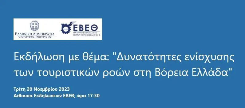 Το Γραφείο Οικονομικών & Εμπορικών Υποθέσεων / ΟΕΥ Βορείου Ελλάδος του Υπουργείου Εξωτερικών διοργανώνει σε συνεργασία με το Εμπορικό και Βιομηχανικό Επιμελητήριο Θεσσαλονίκης (ΕΒΕΘ), εκδήλωση με θέμα «Δυνατότητες ενίσχυσης των τουριστικών ροών στη Βόρεια Ελλάδα», τη Δευτέρα 20 Νοεμβρίου 2023 και ώρα 17:30, στην Αίθουσα Εκδηλώσεων του ΕΒΕΘ (Τσιμισκή 29, 2ος όροφος).