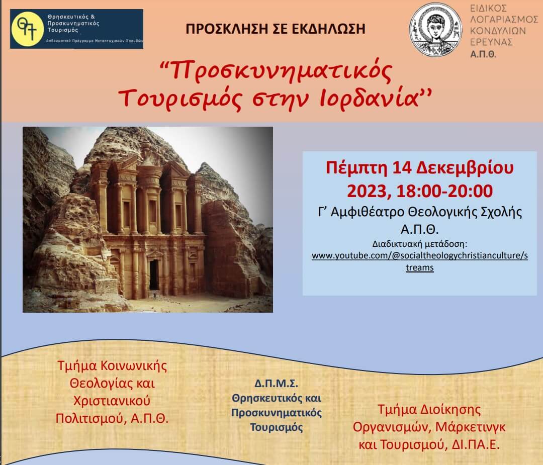 Το Διατμηματικό Πρόγραμμα Μεταπτυχιακών Σπουδών (Δ.Π.Μ.Σ.) «Θρησκευτικός και Προσκυνηματικός Τουρισμός», που λειτουργεί με τη συνεργασία του Τμήματος Κοινωνικής Θεολογίας και Χριστιανικού Πολιτισμού του Α.Π.Θ. και του Τμήματος Διοίκησης Οργανισμών, Μάρκετινγκ και Τουρισμού του ΔΙ.ΠΑ.Ε., διοργανώνει επίσημη εκδήλωση με θέμα «Παρουσίαση του Προσκυνηματικού Τουρισμού της Ιορδανίας» την Πέμπτη 14 Δεκεμβρίου 2023, στις 6 – 8 το απόγευμα, στο Γ’ αμφιθέατρο της Θεολογικής Σχολής (2ος όροφος).