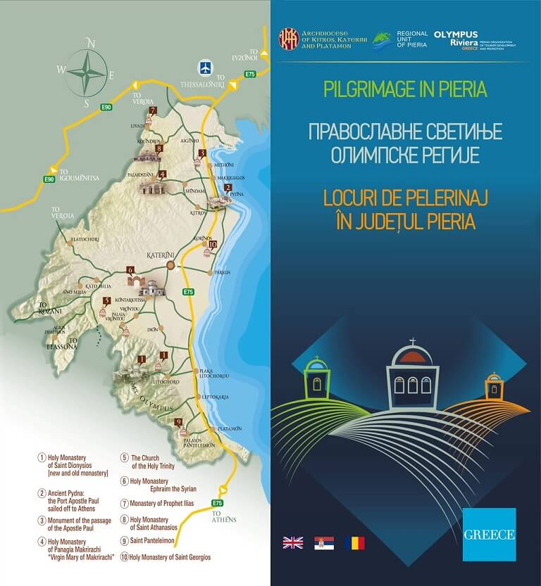 Προς αυτήν την κατεύθυνση ο Μητροπολίτης Γεώργιος, η Αντιπεριφερειάρχης Πιερίας, Σοφία Μαυρίδου και ο πρόεδρος του Πιερικού Οργανισμού Τουριστικής Ανάπτυξης και Προβολής (Π.Ο.Τ.Α.Π.), Γιώργος Καραλής, αφουγκραζόμενοι το ζητούμενο προχώρησαν στην από κοινού έκδοση ενός πολύγλωσσου τουριστικού οδηγού, ώστε να βοηθήσουν τους επισκέπτες να γνωρίσουν τα Προσκυνήματα της Πιερίας και να εκκλησιαστούν στους περίλαμπρους Ιερούς Ναούς, τα Μοναστήρια και τα Ξωκλήσια, στις περιοχές όπου ο προσκυνητής θα γίνει κοινωνός του λατρευτικού και Θείου Μεγαλείου, αλλά και θα γοητευτεί από την εκφραστικότητα της φύσης.