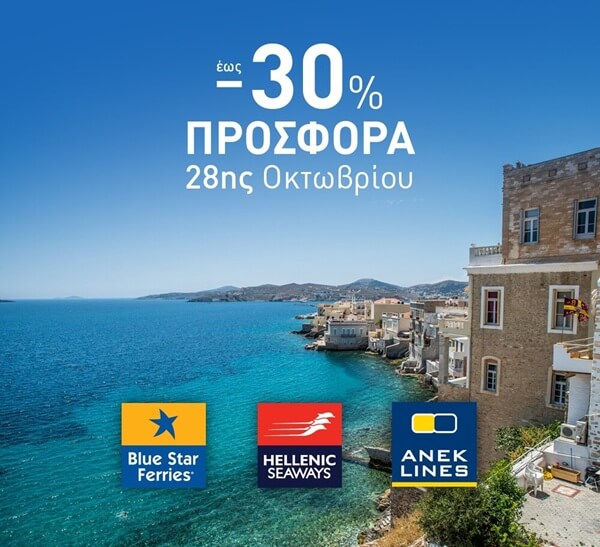 Οι εταιρείες Blue Star Ferries, Hellenic Seaways, ΑΝΕΚ Lines & Superfast Ferries, μέλη του Ομίλου Attica, προσφέρουν εκπτώσεις έως και 30% για τα δρομολόγια που θα εξυπηρετήσουν τη φθινοπωρινή απόδραση της 28ης Οκτωβρίου.