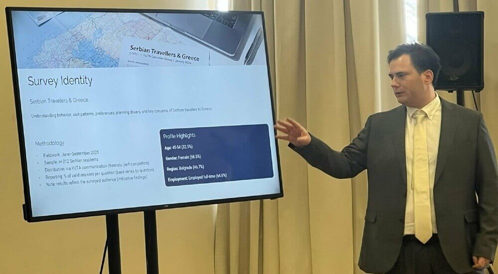 Τα στοιχεία αυτά προέκυψαν από έρευνα για τη σερβική τουριστική αγορά, που πραγματοποίησε η Διεύθυνση Τουριστικής Προβολής του ΕΟΤ σε συνεργασία με την Ένωση Τουριστικών Πρακτόρων Σερβίας (YUTA) και παρουσιάστηκε την Πέμπτη 19 Φεβρουαρίου σε ειδική εκδήλωση στο πλαίσιο της συμμετοχής του ΕΟΤ στη Διεθνή Έκθεση Τουρισμού του Βελιγραδίου 2026 (International Fair of Tourism – IFT).