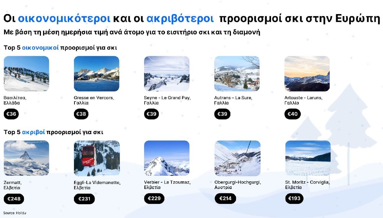 Η Holidu, η πύλη κράτησης ενοικιαζόμενων καταλυμάτων διακοπών (www.holidu.gr), αποφάσισε να πραγματοποιήσει μια μελέτη ώστε να προσδιορίσει τα ευρωπαϊκά χιονοδρομικά κέντρα που προσφέρουν τις πιο συμφέρουσες τιμές.
