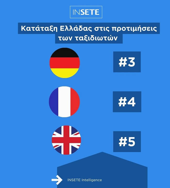 Η Ελλάδα παραμένει, όπως και πέρυσι, στην ίδια θέση κατάταξης των προτιμώμενων προορισμών για Γερμανούς και Γάλλους, στην 3η και 4η  θέση αντίστοιχα, ενώ στην περίπτωση των Βρετανών συγκαταλέγεται επίσης στους πέντε κορυφαίους και ειδικότερα στην 5η θέση, έχοντας ωστόσο υποχωρήσει κατά δύο θέσεις.