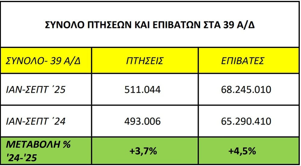 Αύξηση 4,5% σημειώθηκε στην επιβατική κίνηση στο πρώτο εννιάμηνο του 2025, στο σύνολο των αεροδρομίων της χώρας που διεξάγονται εμπορικές πτήσεις (39 αεροδρόμια: 24 της Υπηρεσίας Πολιτικής Αεροπορίας – ΥΠΑ, 14 της Fraport Greece και το αεροδρόμιο της Αθήνας).